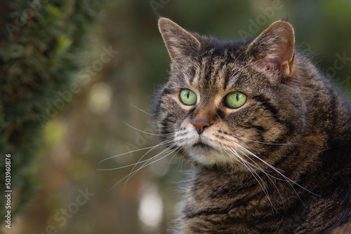 © rhoenes, Fototapeta premium Portrait of a beautiful tabby cat with big green eyes in a dreamy garden scenery