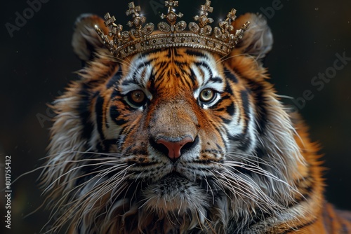 Naklejka premium Portrait of a beautiful tiger with a crown on his head.