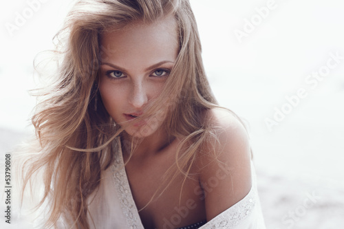 Fototapeta premium Portrait of a beautiful woman, the wind fluttering hair