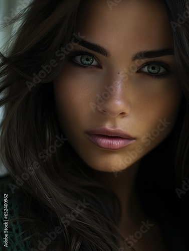Fototapeta premium Portrait of a Beautiful Woman with Green Eyes and Dark Hairs.