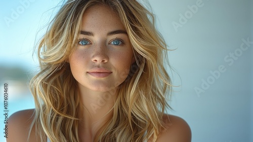 © visoot, Fototapeta premium Portrait of a beautiful woman with long blonde hair, blue eyes, and a white sleeveless top.