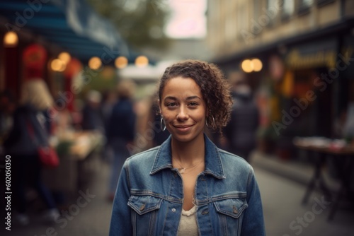 Fototapeta premium Portrait of a beautiful young african american woman with curly hair, wearing a denim jacket, standing in a street cafe.