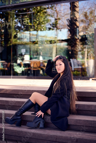 © Carlos, Fototapeta premium Portrait of a beautiful young Asian woman in a black coat and boots