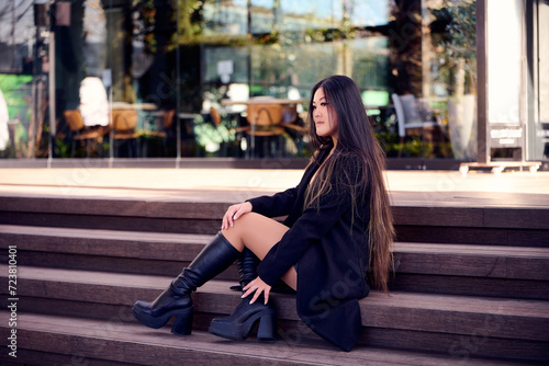 Fototapeta premium Portrait of a beautiful young Asian woman in a black coat and boots