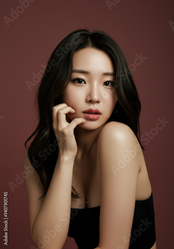 © ProArt Studios, Fototapeta premium Portrait of a Beautiful Young Asian Woman with Smooth Skin and Long Wavy Hair, Wearing a Black Top Against a Maroon Background. Ideal for Beauty, Fashion, and Skincare Advertising.