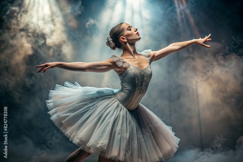 © Юлия Клюева, Naklejka premium Portrait of a beautiful young ballerina . The radiance of Russian ballet, a ballerina in a tutu performs on stage.
