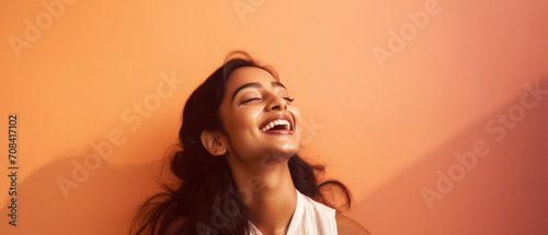 © Synthetica, Fototapeta premium Portrait of a beautiful young indian woman laughing against orange wall