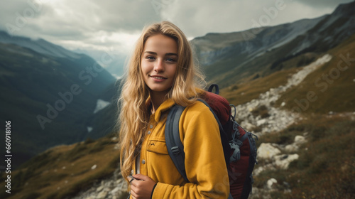 © Valua Vitaly, Naklejka premium Portrait of a beautiful young smiling woman with backpack on the background of mountains. Teenage girl with backpack hiking in the mountains, looking at camera. AI generated