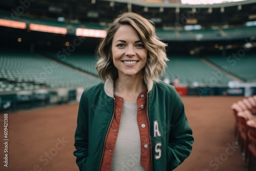 Fototapeta premium Portrait of a beautiful young woman in a green jacket smiling at the camera while standing in a stadium