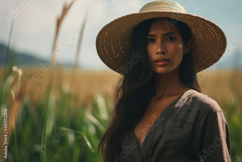© Alex, Obraz premium Portrait of a beautiful young woman in a straw hat on a wheat field.