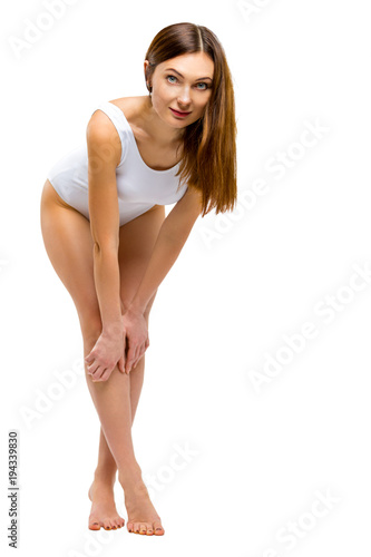 Obraz premium Portrait of a beautiful young woman in a white bathing suit. Isolated photo in full length