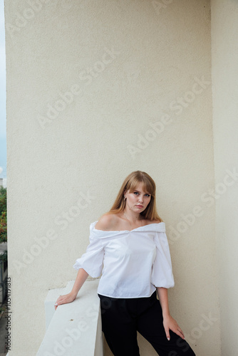Fototapeta premium Portrait of a beautiful young woman in a white blouse and black pants