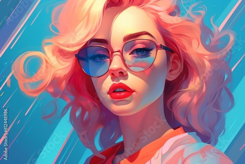 © SayLi, Obraz premium portrait of a beautiful young woman with long blonde hair and pink sunglasses with blue background. amazing cartoonish artstyle with vibrant colors. Generative AI