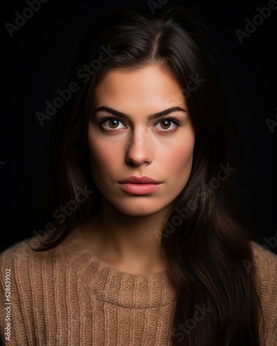© AberrantRealities, Fototapeta premium portrait of a beautiful young woman with long brown hair on a black background