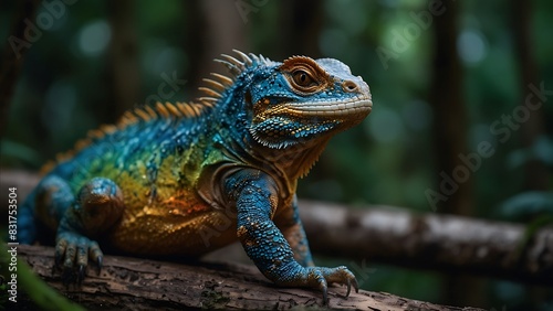 © Rizal, Obraz premium portrait of a beautifully patterned iguana relaxing on a tree trunk with a blurred background