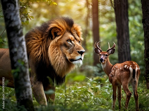 © Roshan, Fototapeta premium Portrait of a big lion and a small deer in the forest