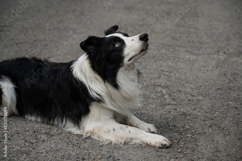 © Михаил Решетников, Fototapeta premium Portrait of a black and white border collie lying on the pavement.