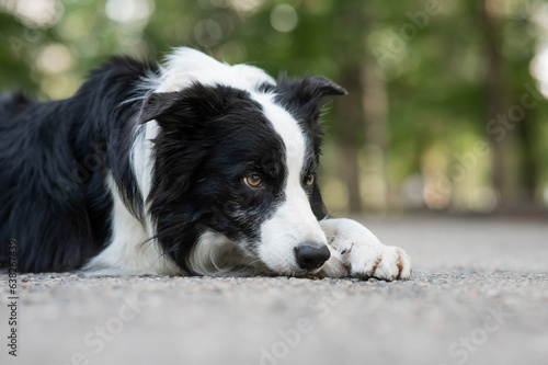 © Михаил Решетников, Fototapeta premium Portrait of a black and white border collie lying on the pavement.