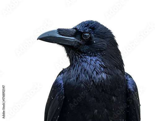 © lisa, Fototapeta premium Portrait of a black bird facing left, with a wet appearance against a dark background, cropped