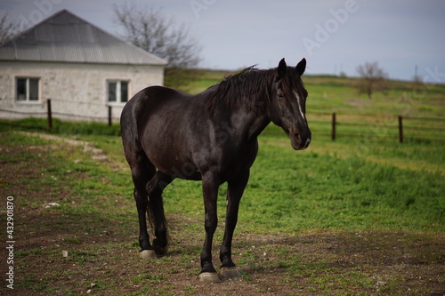 © Omega, Obraz premium Portrait of a black horse grazing near a white house on a spring day