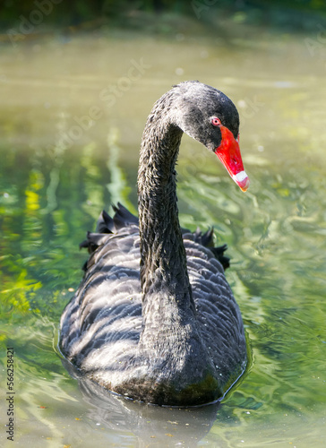 Fototapeta premium Portrait of a black swan. Bird with black plumage. Cygnus atratus. Waterbird.