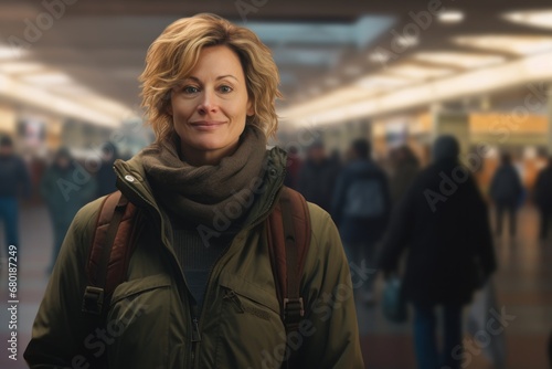© CogniLens, Fototapeta premium Portrait of a blissful woman in her 50s donning a durable down jacket against a bustling airport terminal background. AI Generation