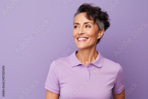 Obraz premium Portrait of a blissful woman in her 40s wearing a sporty polo shirt isolated in pastel purple background