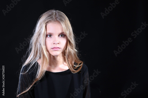 Fototapeta premium Portrait of a blonde girl with long hair on a black background. Emotional...