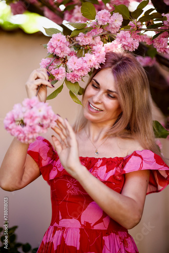 Obraz premium portrait of a blonde woman next to a blooming Japanese cherry tree on a...