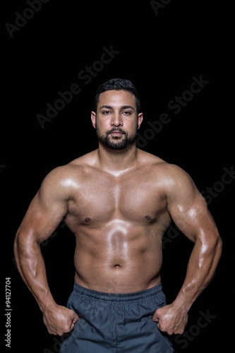 Fototapeta premium Portrait of a bodybuilder man flexing muscles