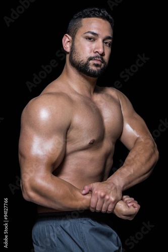 Fototapeta premium Portrait of a bodybuilder man flexing muscles