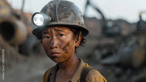Fototapeta premium Portrait of a boy with a flashlight on his helmet, dirty face, soft-focus background emphasizing the dark mine shaft, child labor.