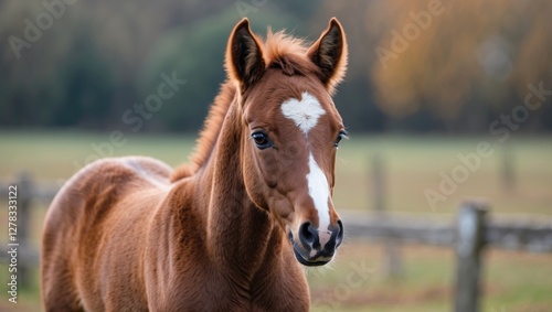 Fototapeta premium Portrait of a brown foal in a serene outdoor setting with blurred background...