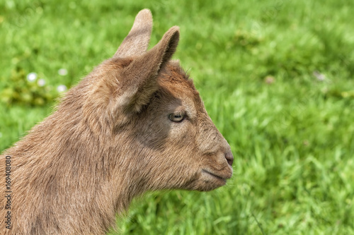 Fototapeta premium Portrait of a brown goatling on the meadow.