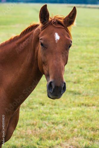 © fotografci, Obraz premium Portrait of a brown horse in a paddock with direct eye contact
