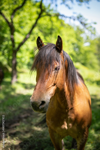 © Marc Andreu, Naklejka premium Portrait of a brown horse in the nature, shallow depth of field