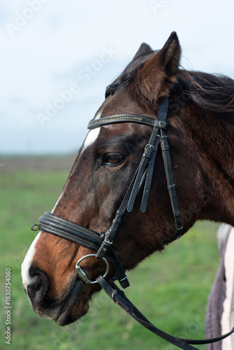 © Лилия Ровенская Фото, Naklejka premium Portrait of a brown horse's face, profile, in horse tack, on a walk.