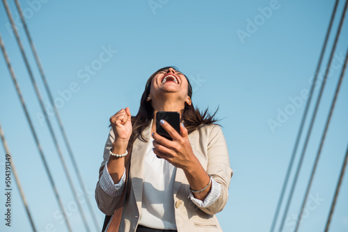 © Anthony Mujica Viera, Obraz premium portrait of a businesswoman laughing to the sky in happiness because she won an award