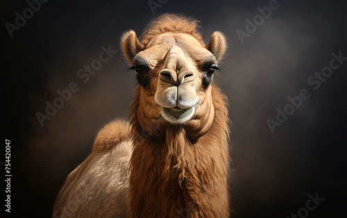 Fototapeta premium Portrait of a camel lstaring at the camera on a dark grey background