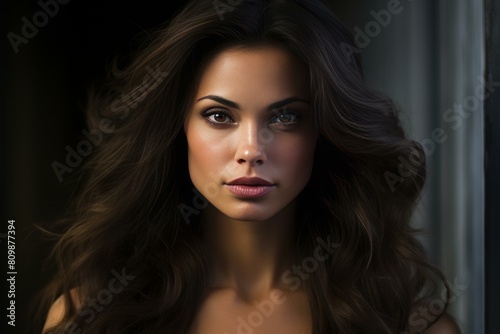 Fototapeta premium Portrait of a captivating woman with lustrous hair and a mesmeric gaze in low...
