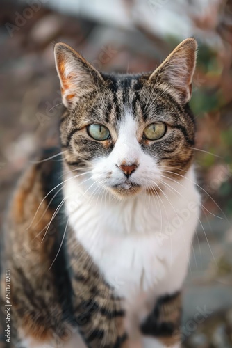 Fototapeta premium Portrait of a cat with green eyes on a outdoor blurred background.
