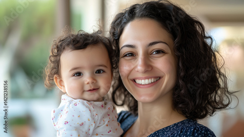© Dirk, Fototapeta premium Portrait of a caucasian Italian loving mom with a cute baby at home, bonding, togetherness. Beautiful photo, poster for mother’s day. Happy family. Young woman with child, daughter or son.