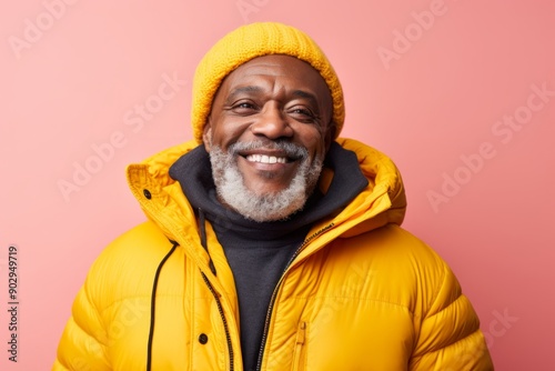 © Markus Schröder, Fototapeta premium Portrait of a cheerful afro-american man in his 60s donning a durable down jacket isolated in pastel yellow background