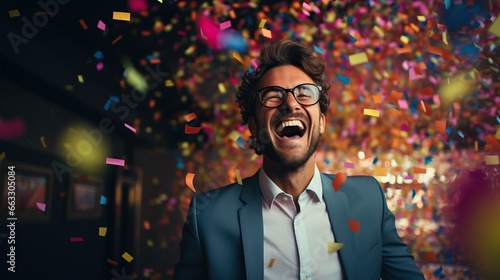 Naklejka premium Portrait of a cheerful businessman with confetti flying around him.
