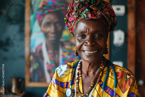Fototapeta premium Portrait of a cheerful elderly african woman with colorful traditional attire, exuding happiness
