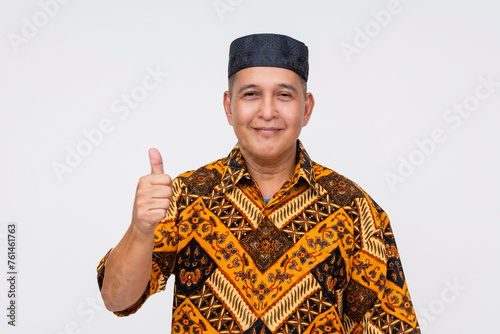Fototapeta premium Portrait of a cheerful Indonesian man wearing a traditional batik shirt and songkok, giving a thumbs-up gesture on a white background.