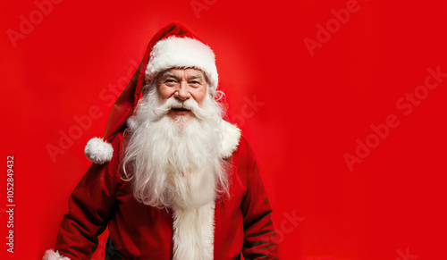 © Julya, Naklejka premium portrait of a cheerful old man Santa Claus on the Christmas red background