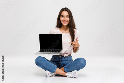 Naklejka premium Portrait of a cheerful young asian girl pointing finger