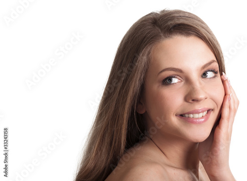 © yuriyzhuravov, Fototapeta premium Portrait of a cheerful young woman looking at copyspace against