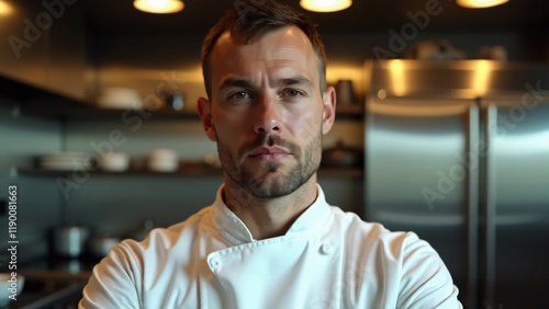 © Ernesto, Fototapeta premium Portrait of a chef in a crisp white jacket, blurred kitchen background with warm lighting. Confident expression and detailed facial textures evoke culinary mastery. No visible hands or tools.